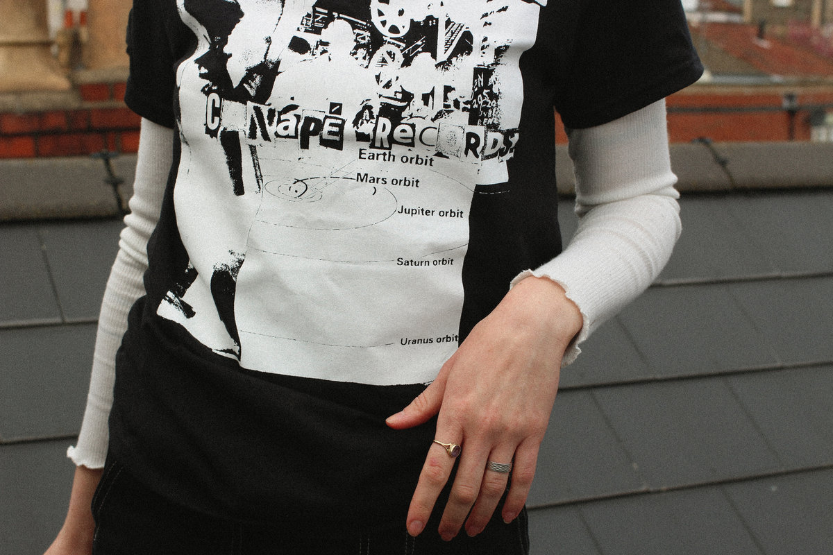 Short-sleeved 'heavy cotton' black T-shirt w/'Orbit-Collage' white screen-print.